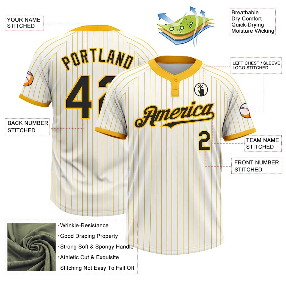 Custom White Gold Pinstripe Black Two-Button Unisex Softball Jersey